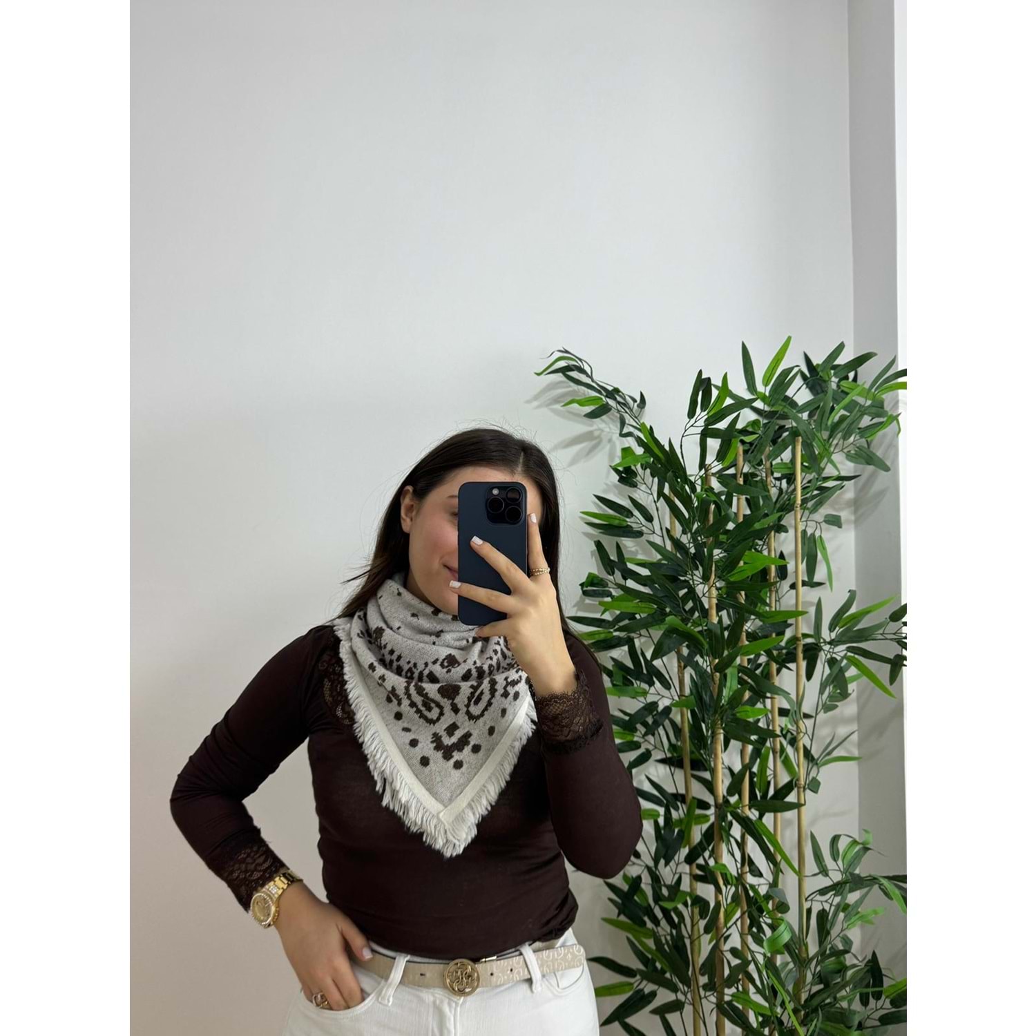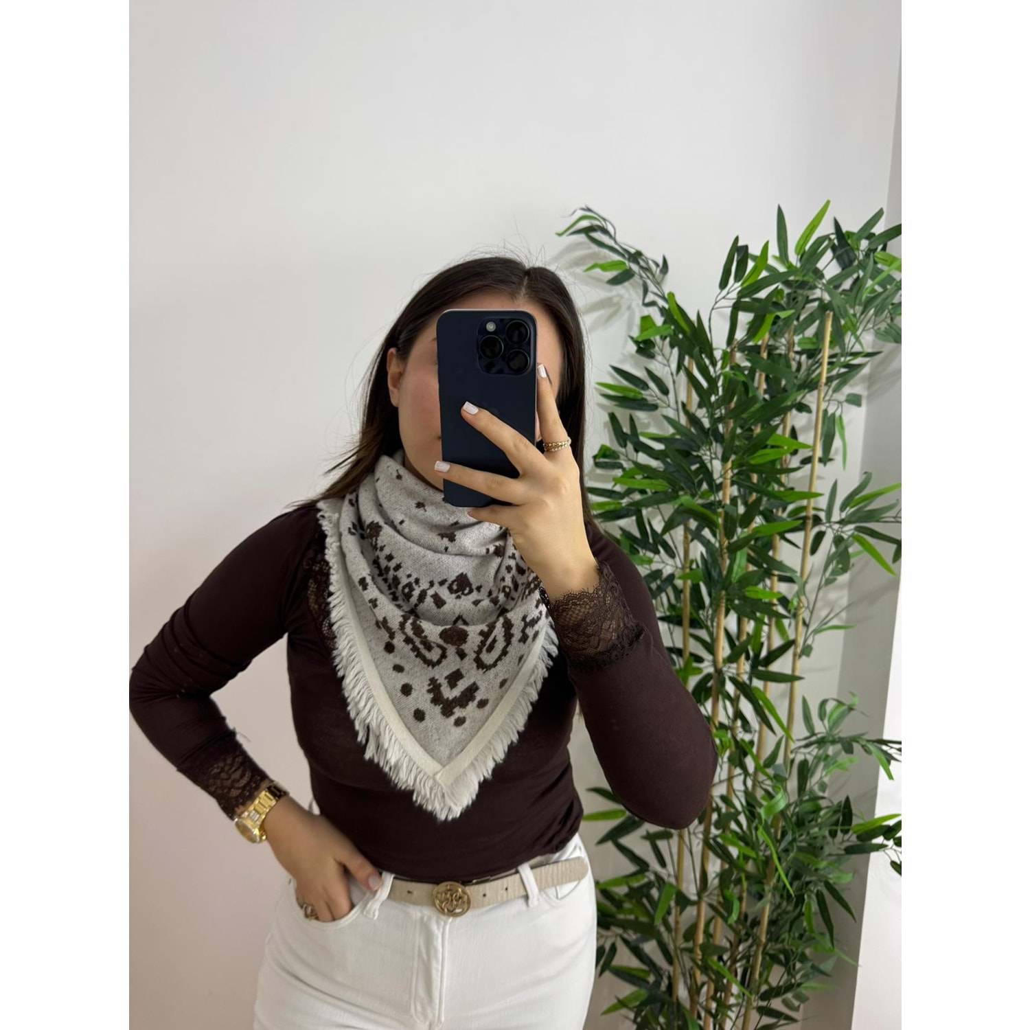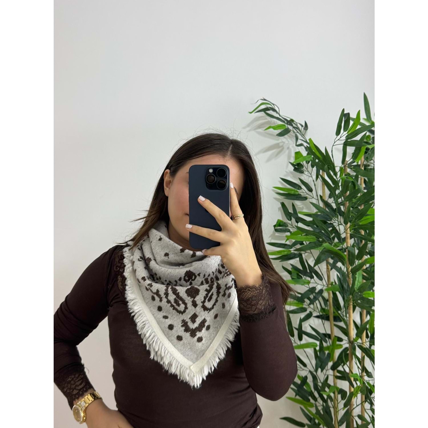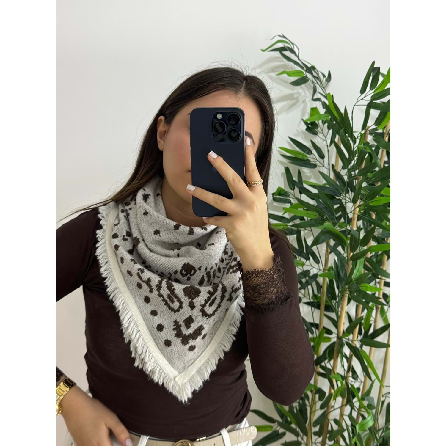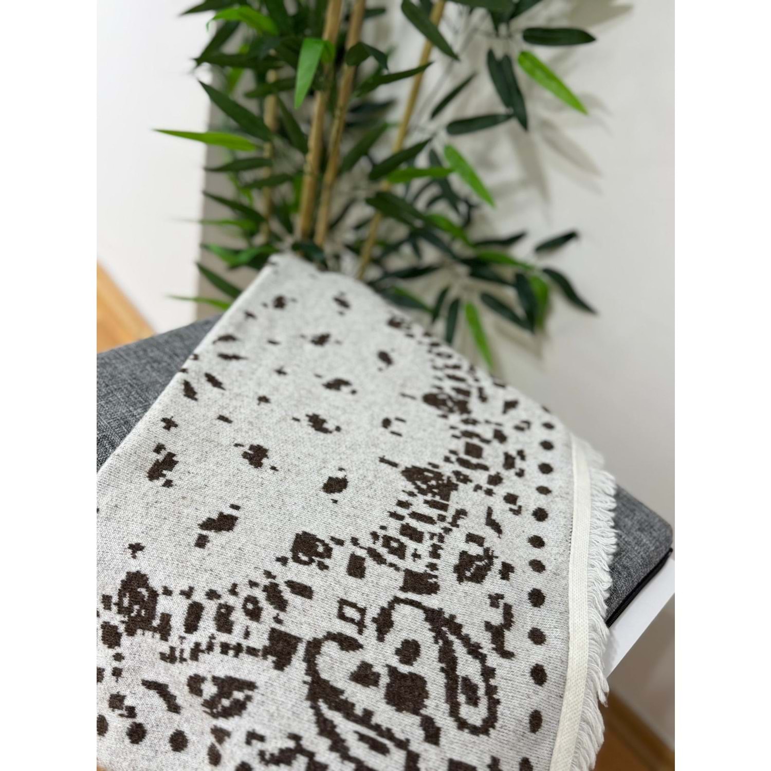 Ekru Desenli Triko Şal
