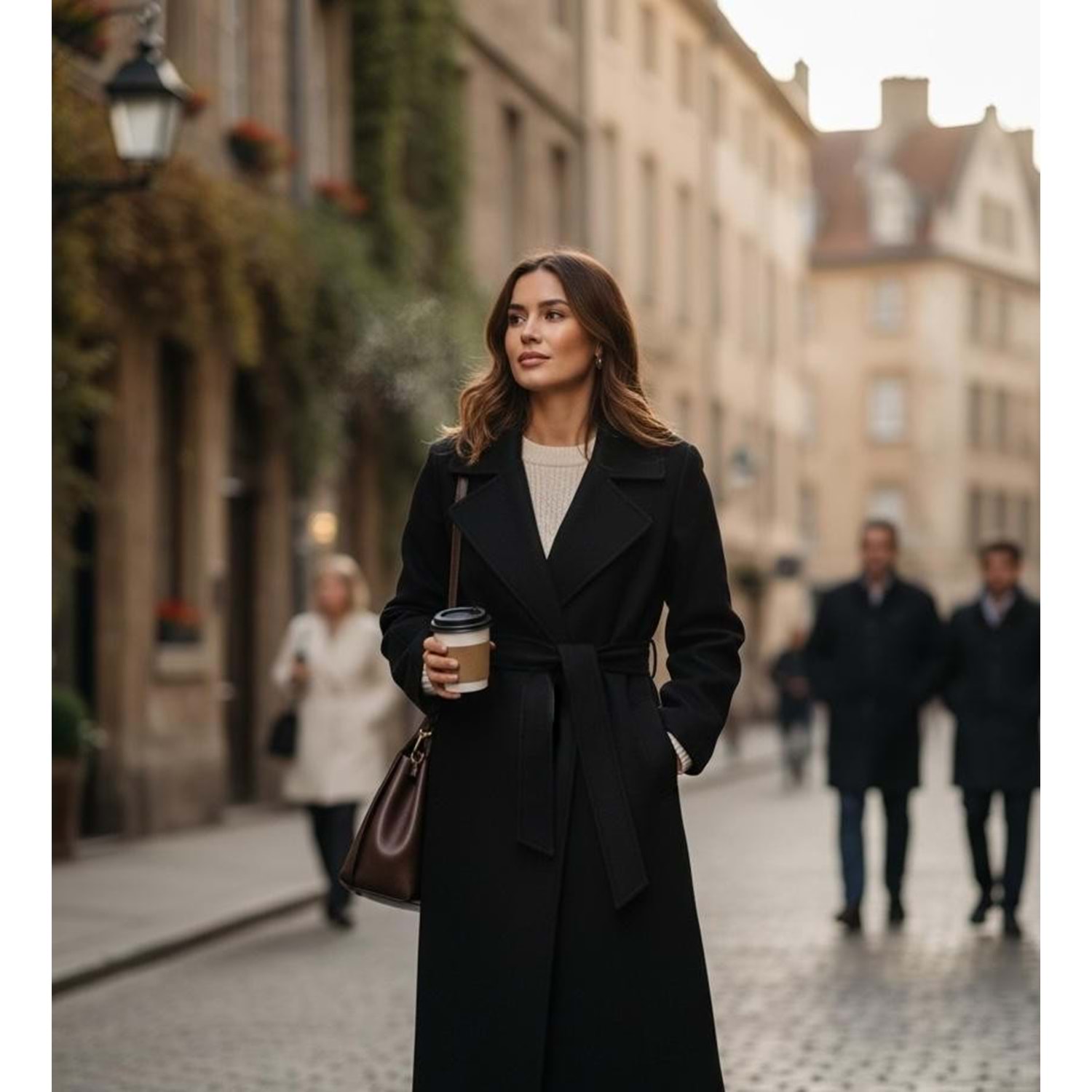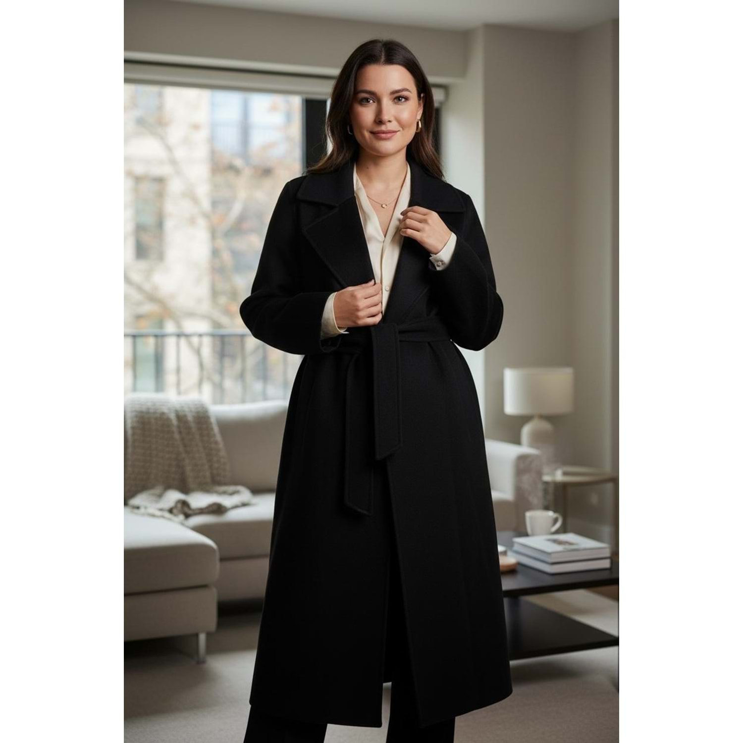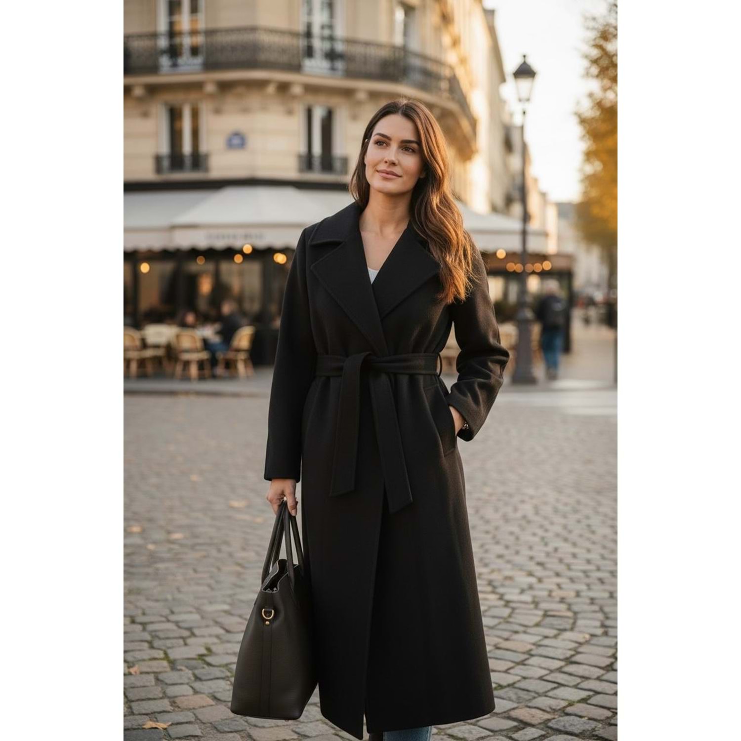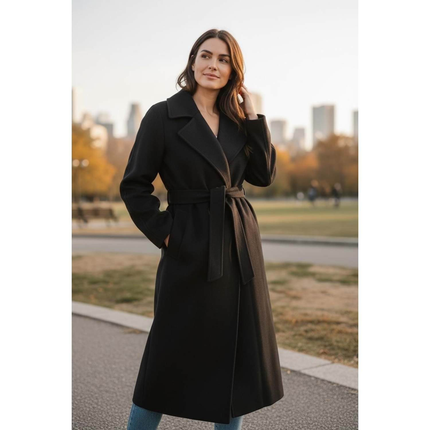 Siyah Astarlı Kemer Detay Cepli Kaşe Kaban
