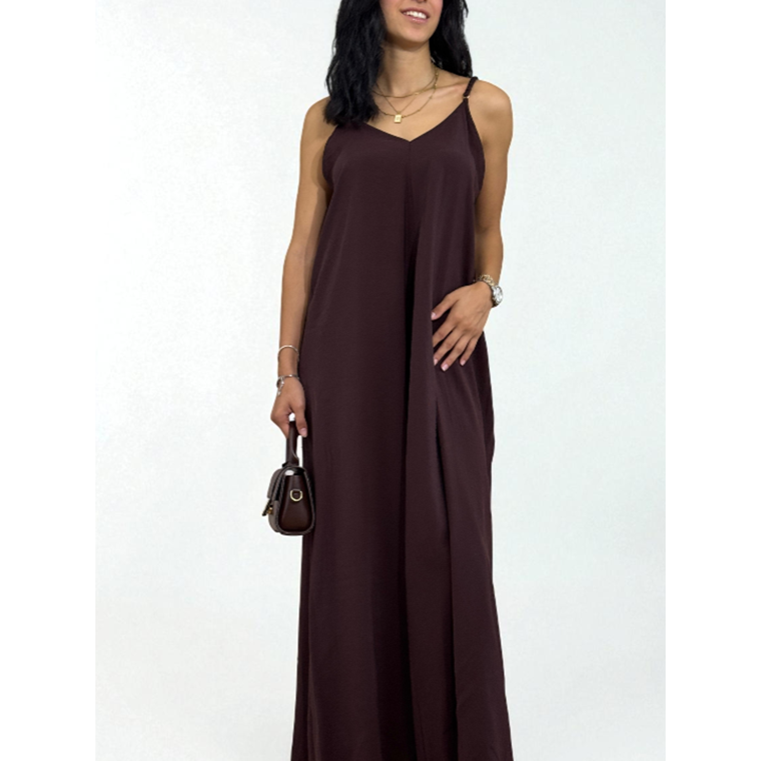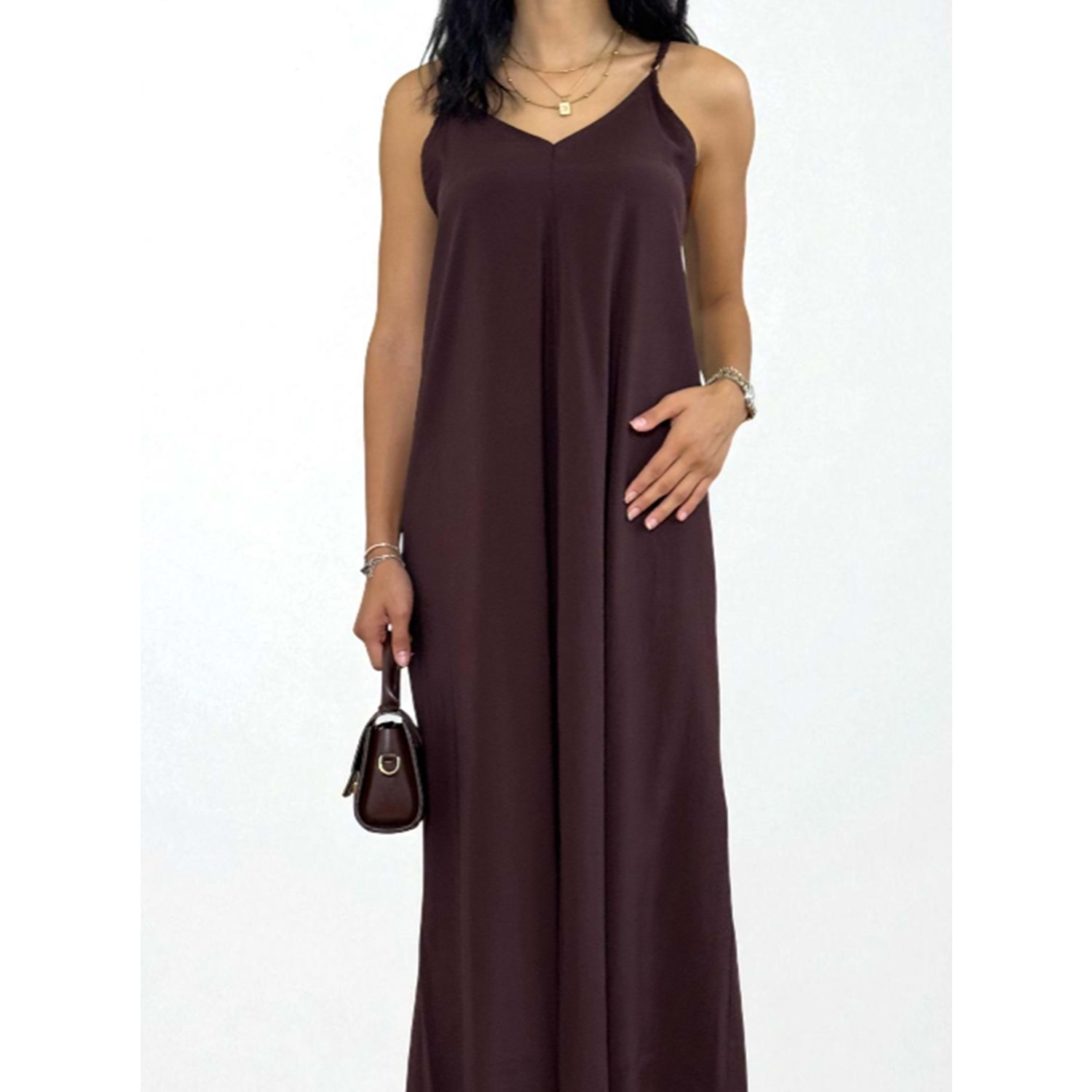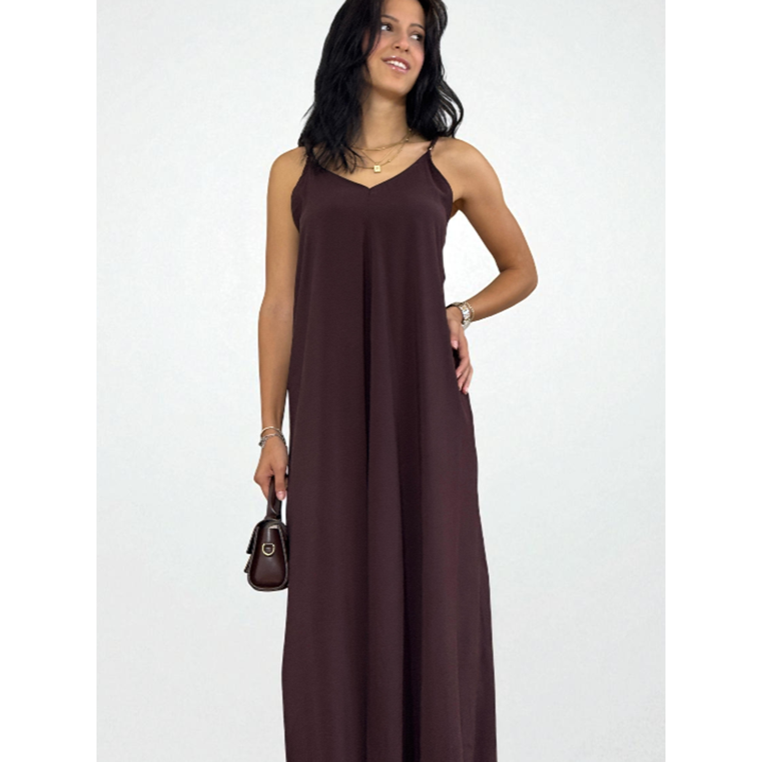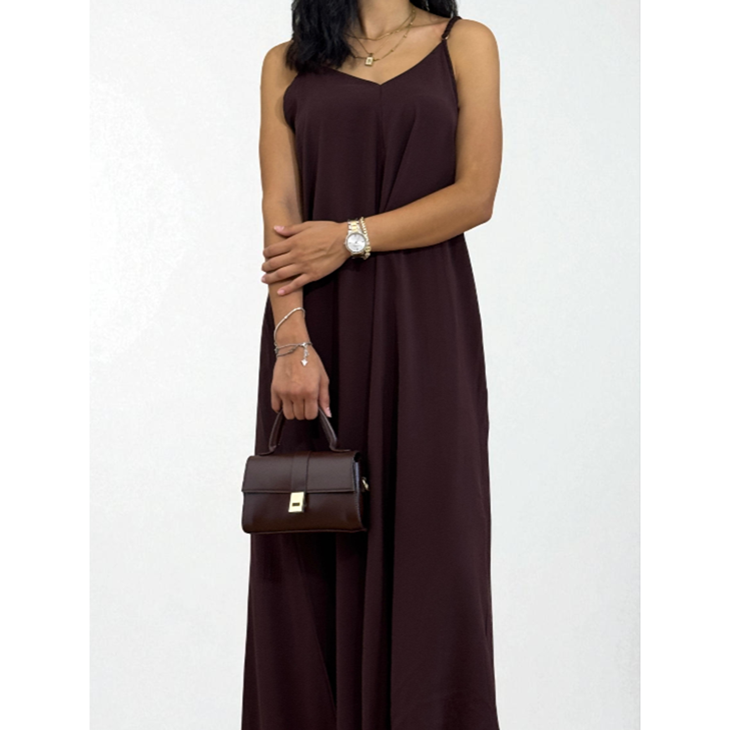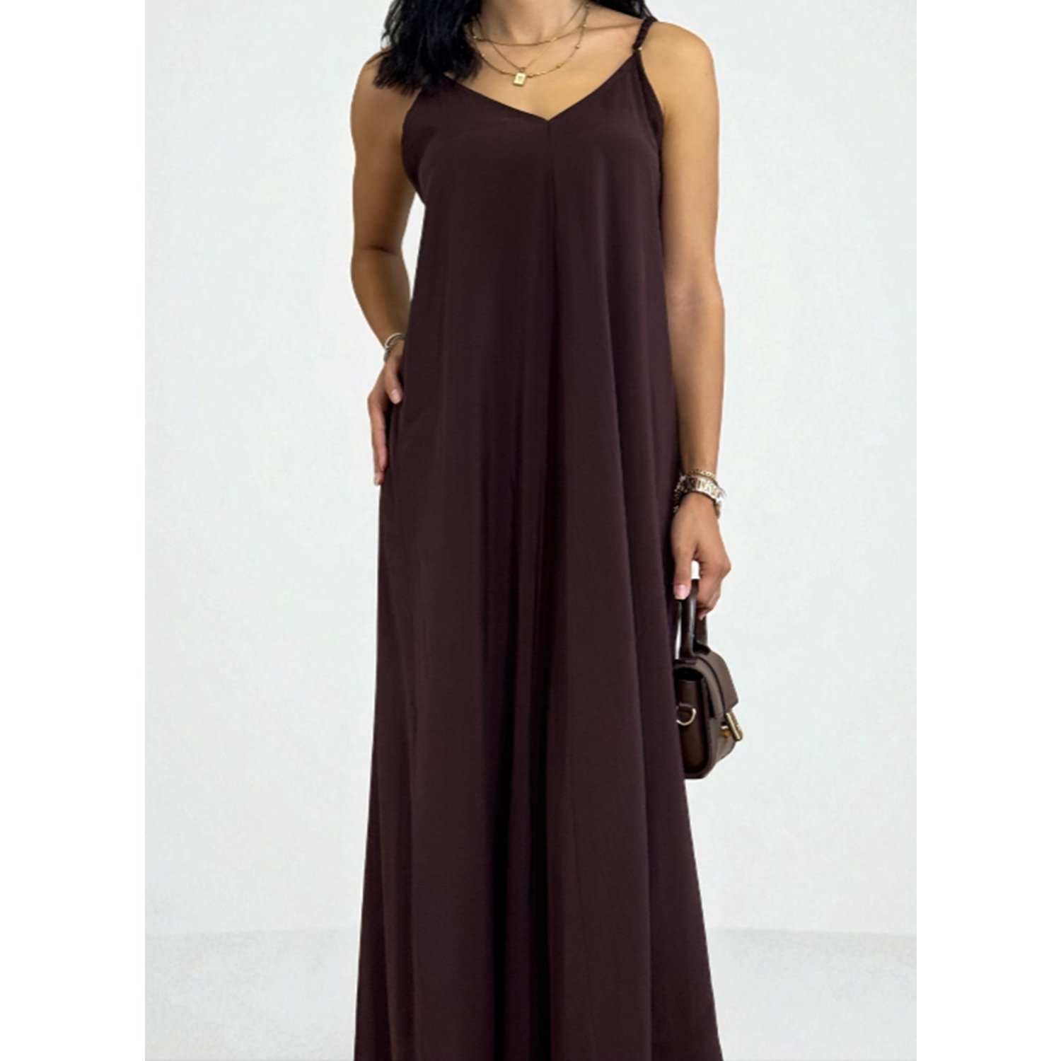 Askılı Sırt Dekolteli Kahverengi Uzun Elbise