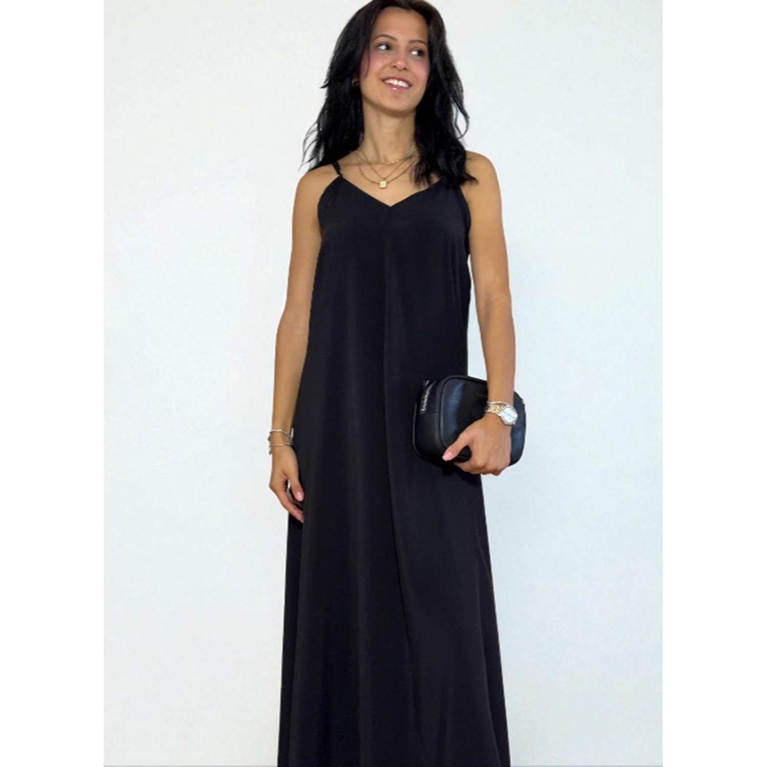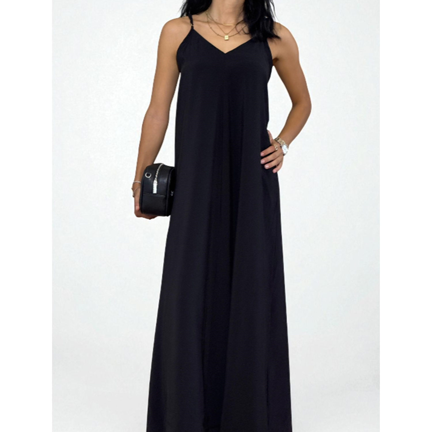 Askılı Sırt Dekolteli Siyah Uzun Elbise