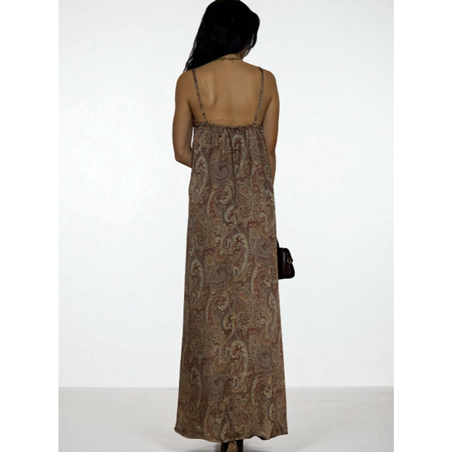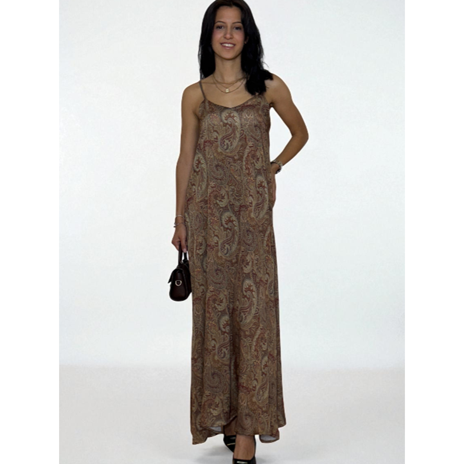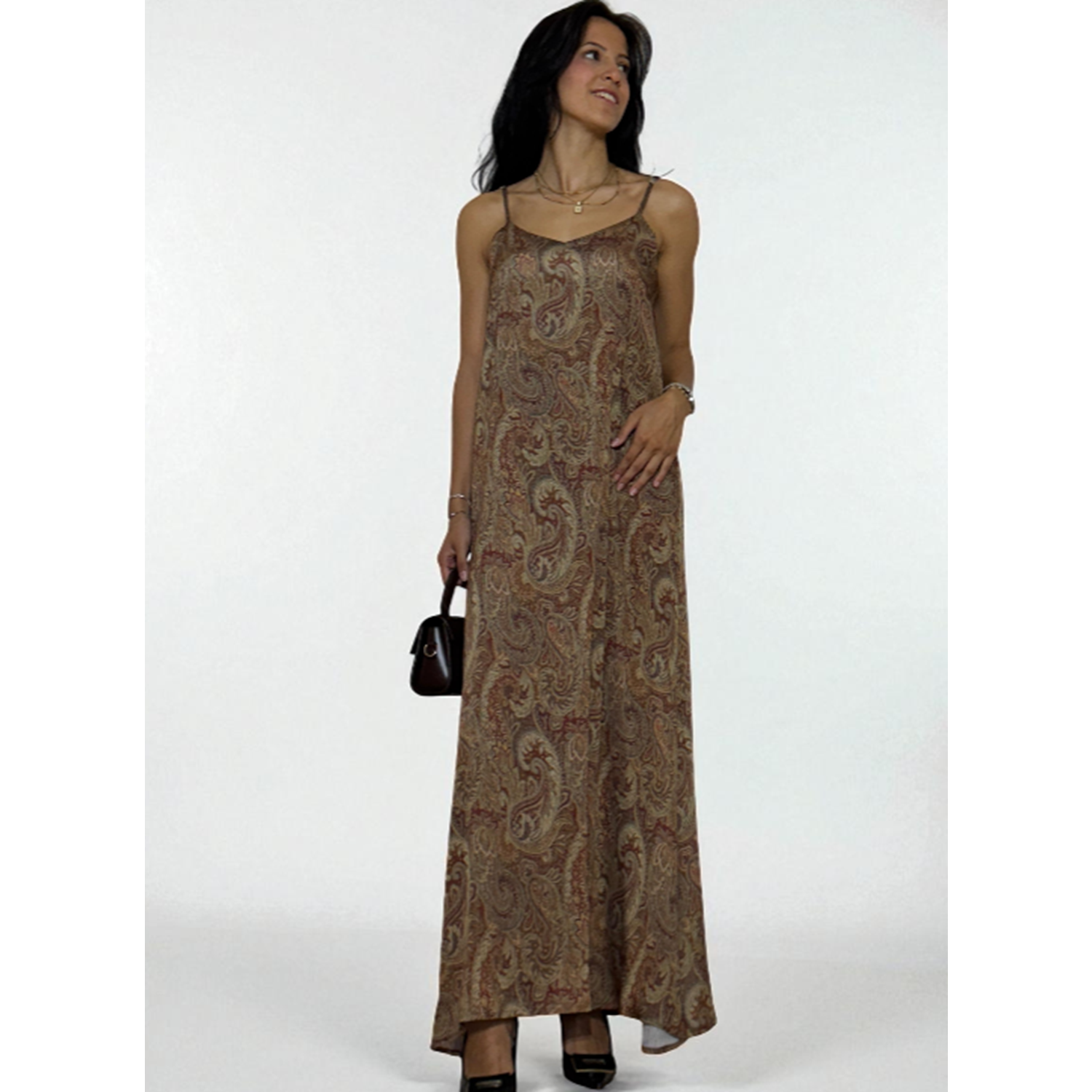 Desenli Askılı Uzun Elbise