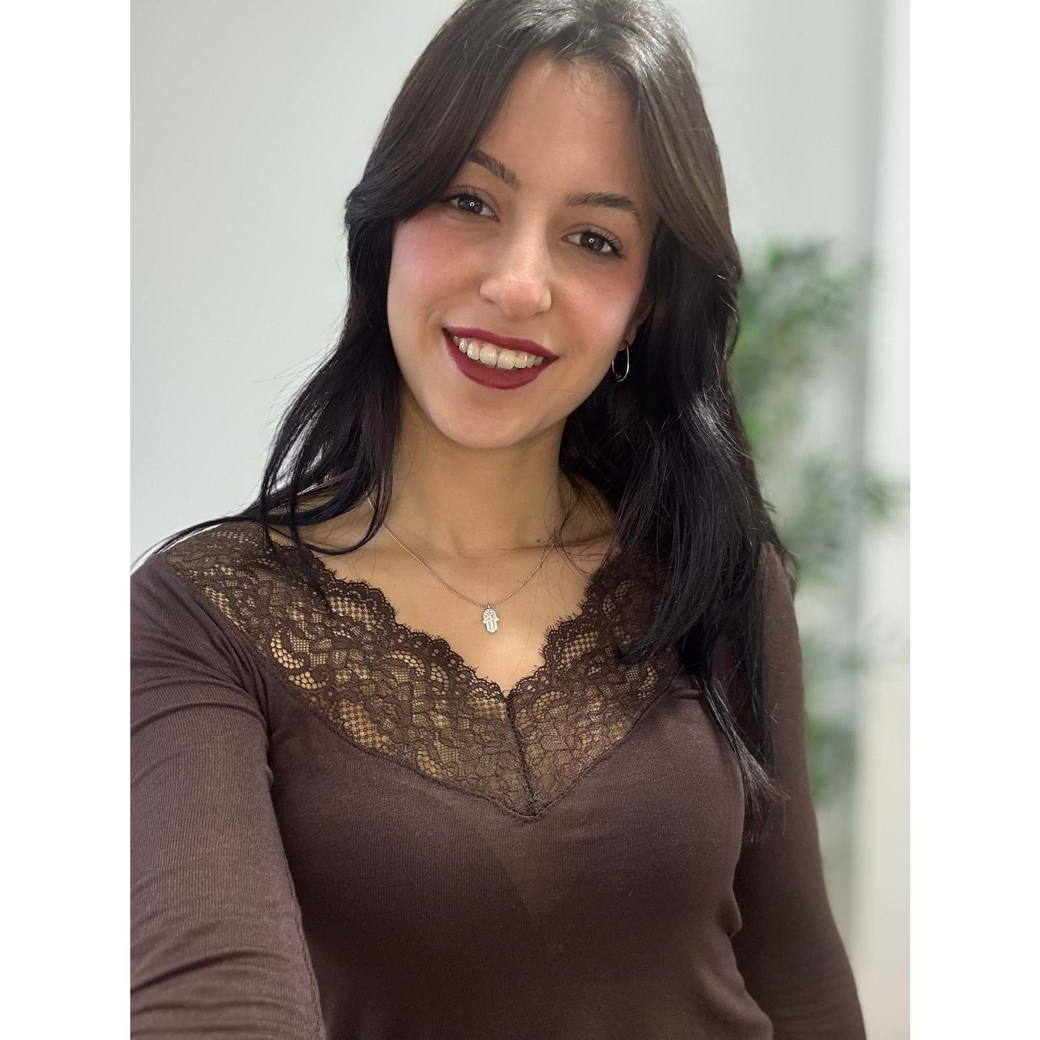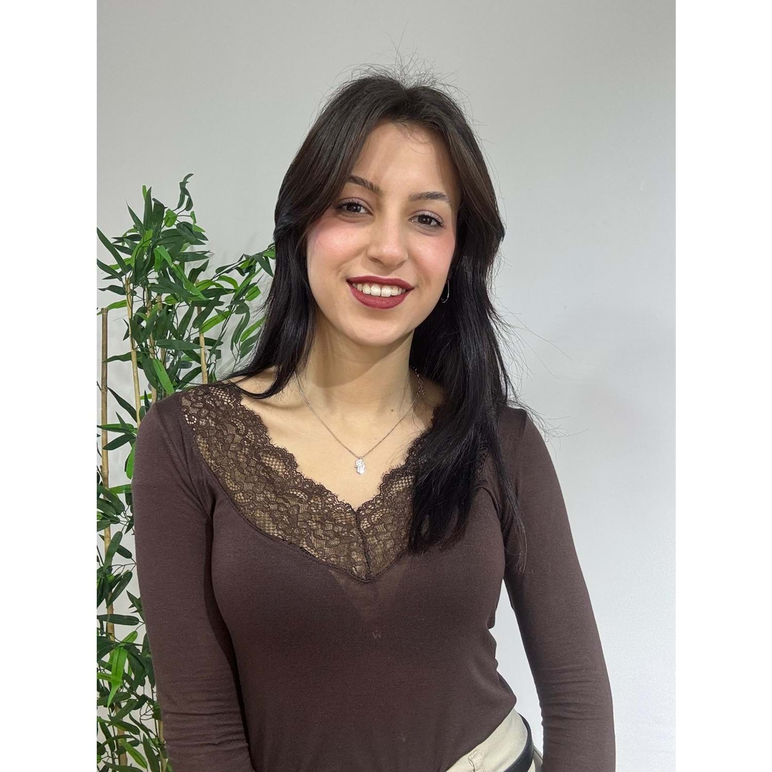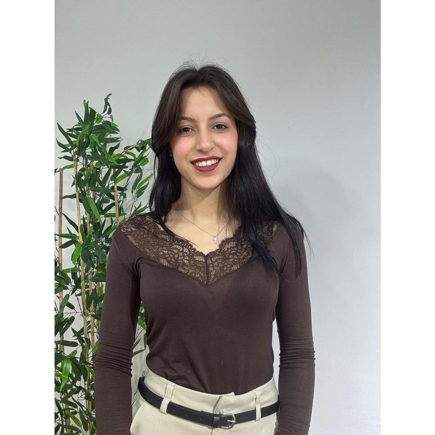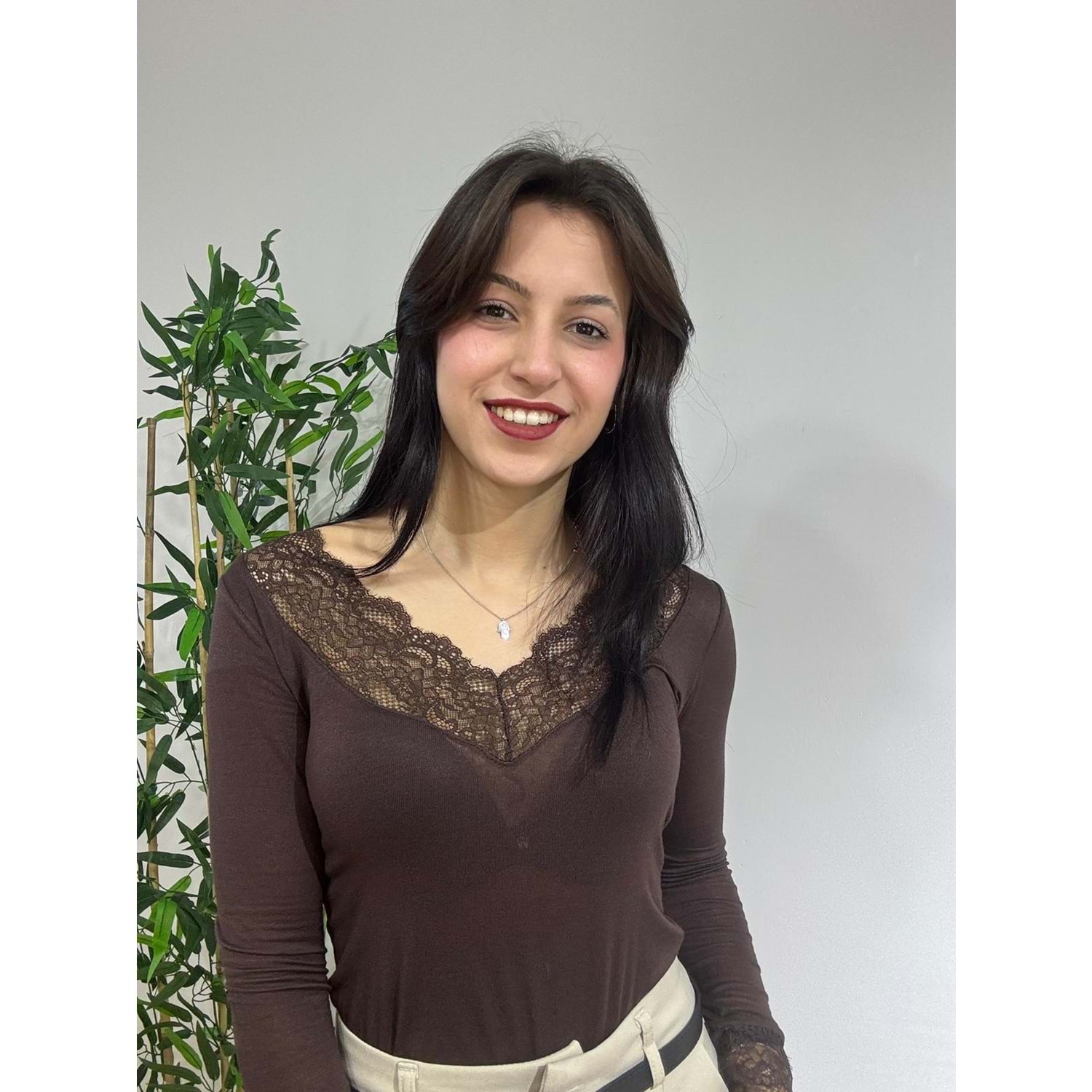 Acı Kahve V Yaka Dantel Detaylı Bluz