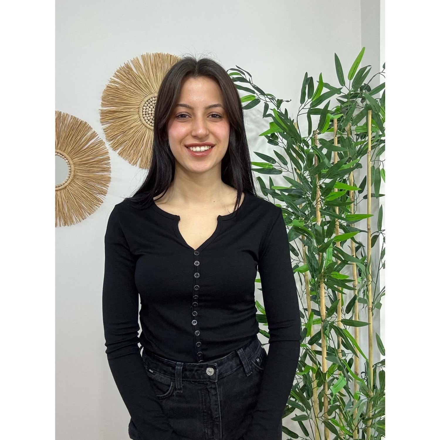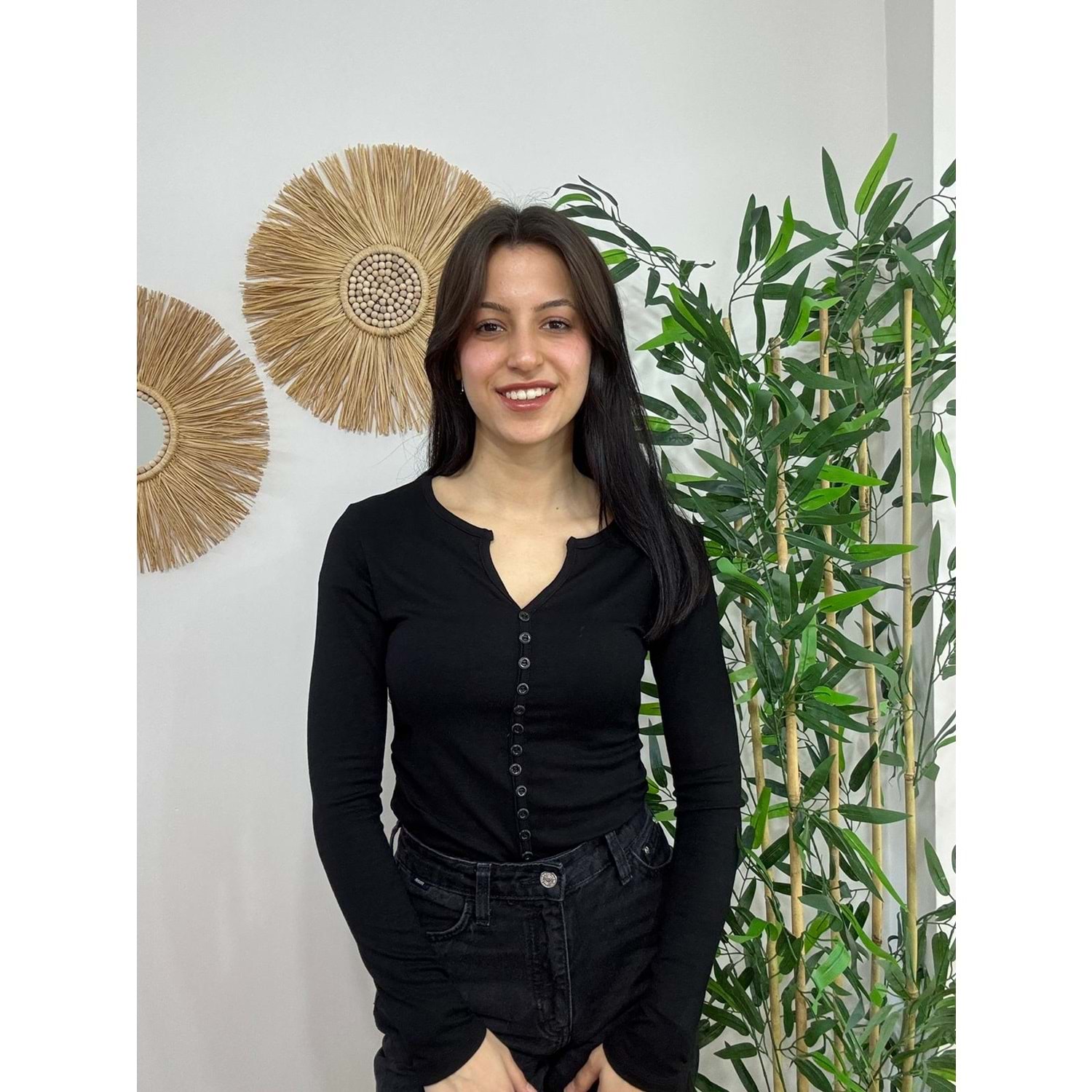 Siyah Bisiklet Yaka Düğmeli Bluz
